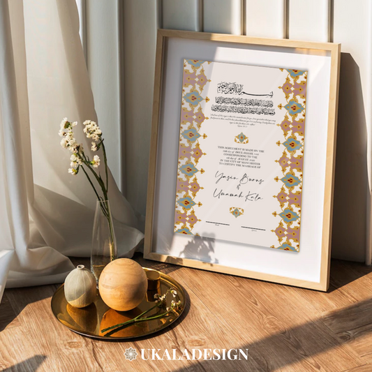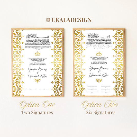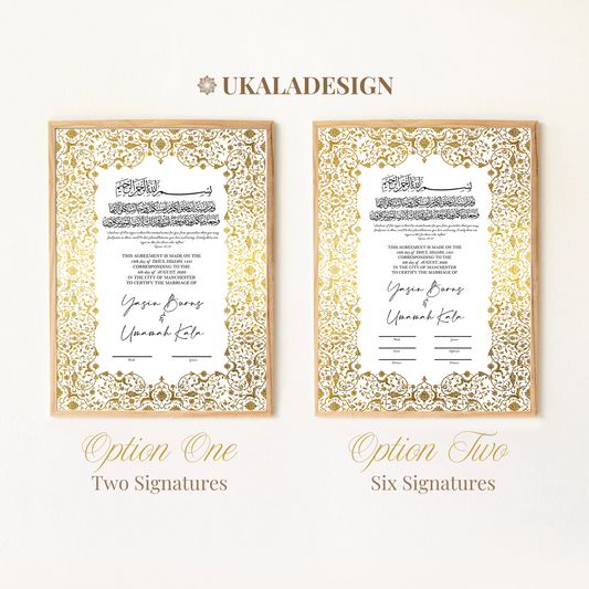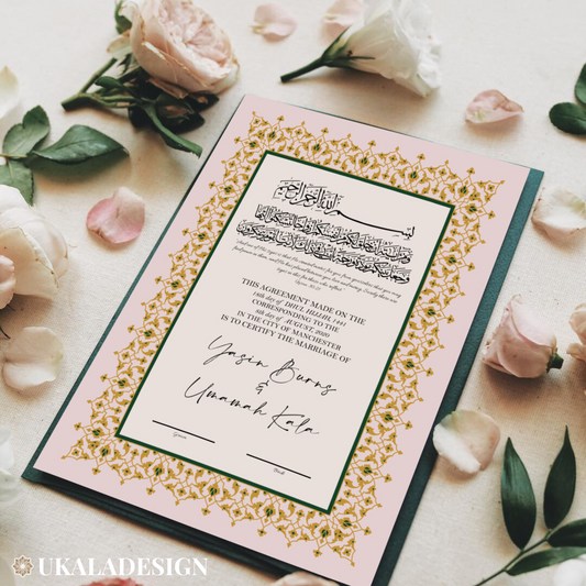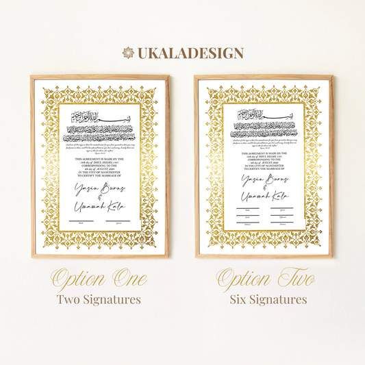 Your Nikkah marks a sacred beginning — a promise made with faith, love, and intention. Our personalised Nikkah certificates are crafted to honour that moment with timeless design and meaningful detail.