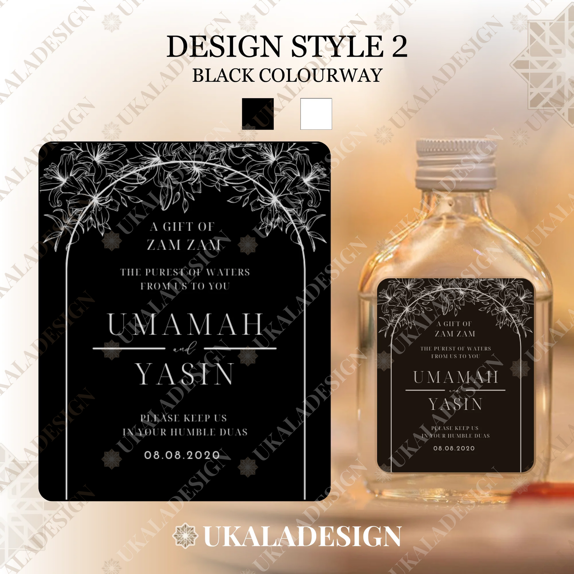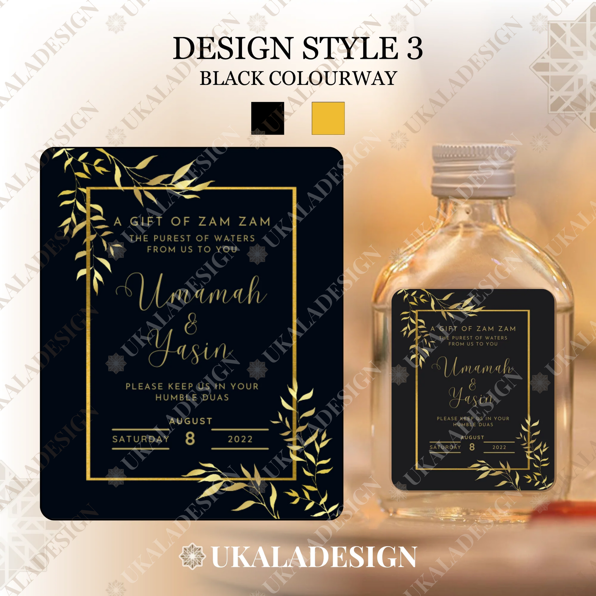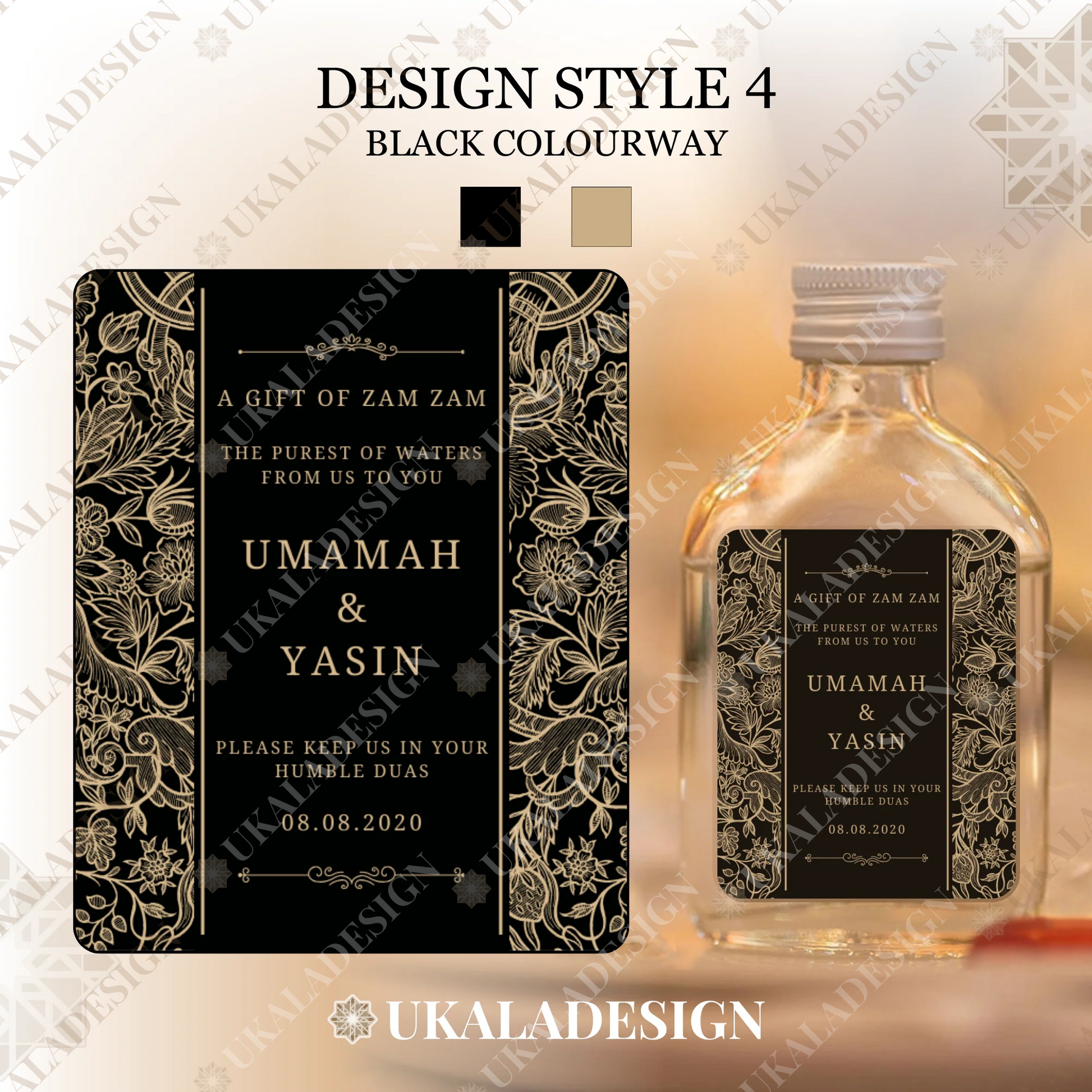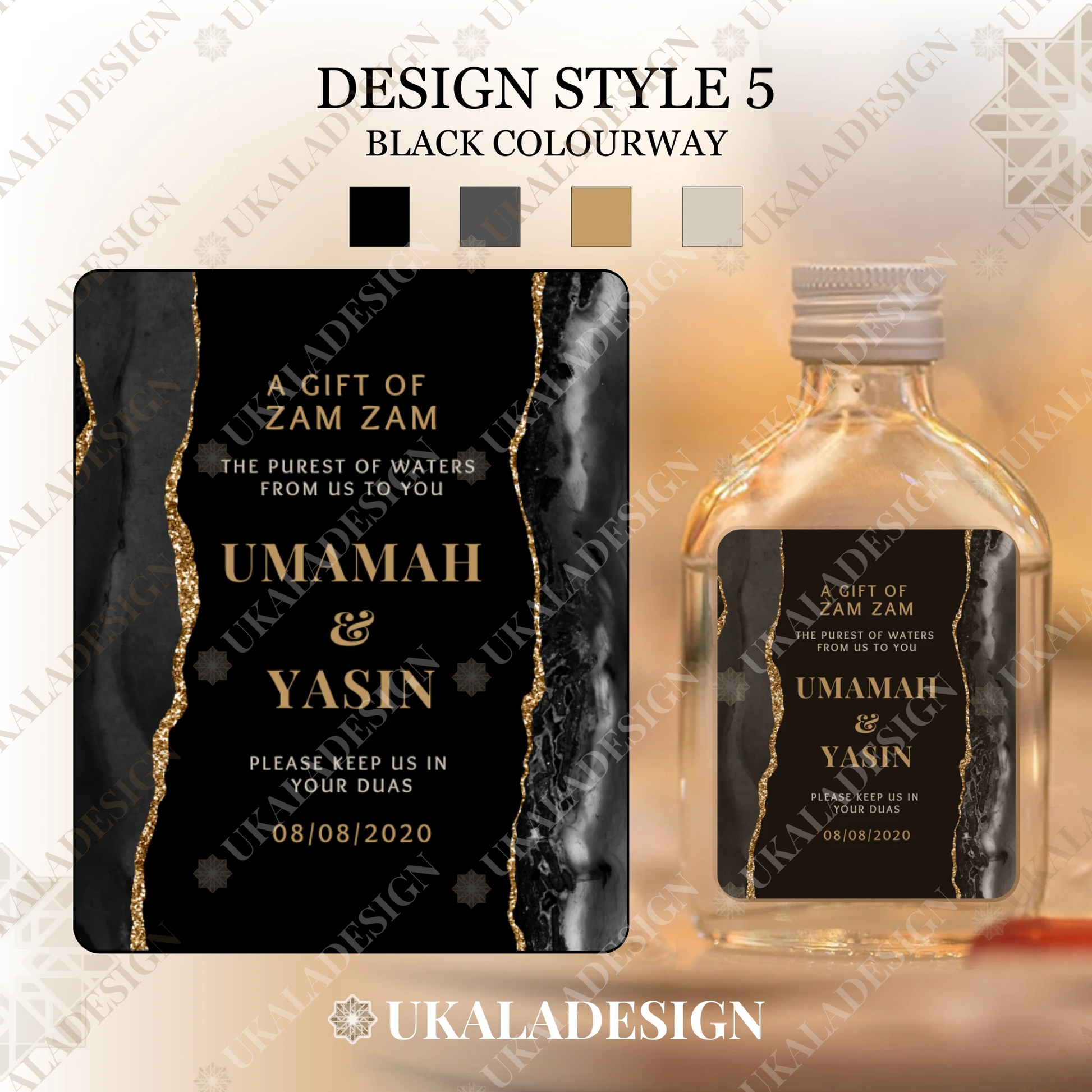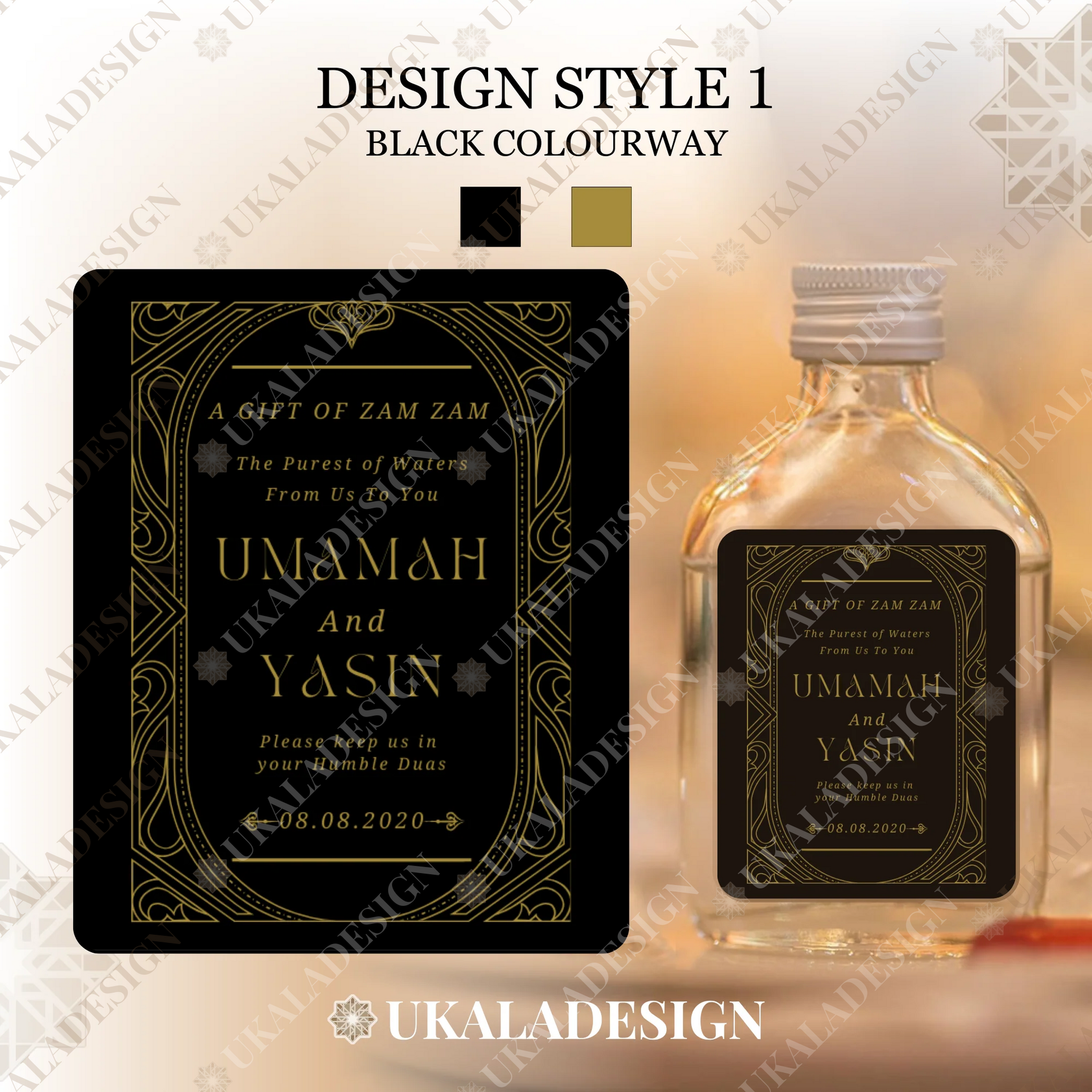 Perfect for Nikaah, Walima, Wedding or any other occasion days or events, our Zam Zam Water Bottle Labels offer an elegant and personalised touch for your special occasion. Specially designed for 50ml rectangular glass or plastic bottles, the most popular type of bottle.